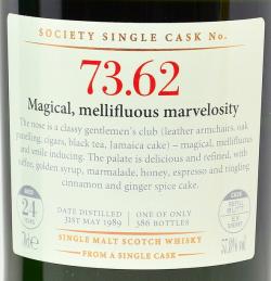 | Rodzaj whisky: | | bez dodatku karmelu, cask strength, limited edition, single cask, unchillfiltered, dest. 31.V.1989, but. 2014, refill cask, "Magical, mellifluous marvelosity", 386 butelek w serii |