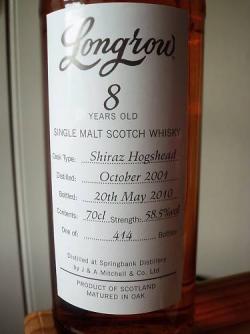 | Rodzaj whisky: | | bez dodatku karmelu, cask strength, limited edition, single cask, unchillfiltered, Shiraz cask, dest. X.2001, but. 20.V.2010, 414 butelek w serii |