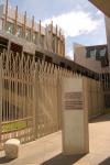 | |  | | Brama budynku Parlamentu Szkocji, wejście od strony Canongate. Uwagę zwracają napisy w obydwu językach.